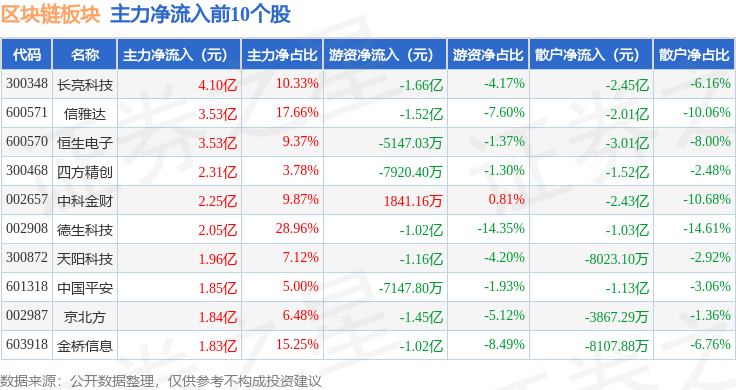 从资金流向上来看,当日区块链板块主力资金净流入20.08亿元,游资资金净流出7760.46万元,散户资金净流出19.3亿元。区块链板块个股资金流向见下表: