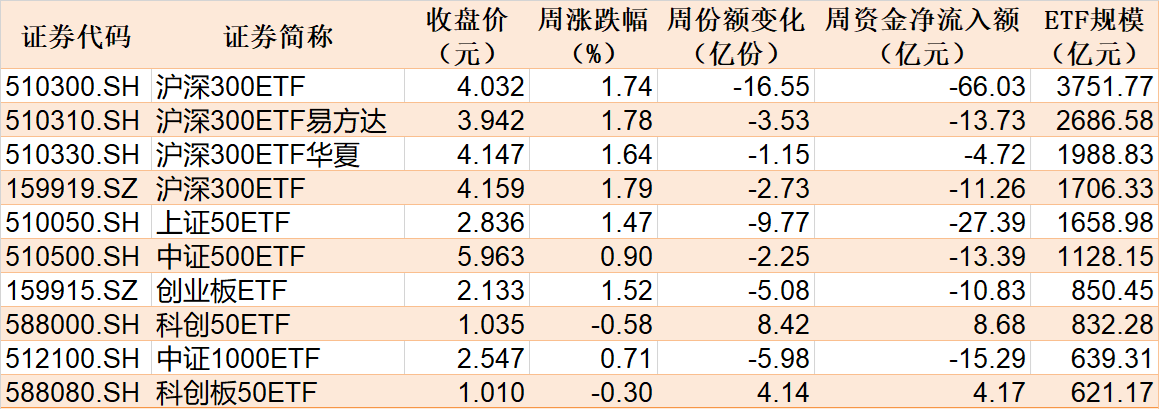 Wind数据显示,上述10只指数ETF本周合计净流出149.79亿元,其中沪深300ETF净流出66.03亿元。