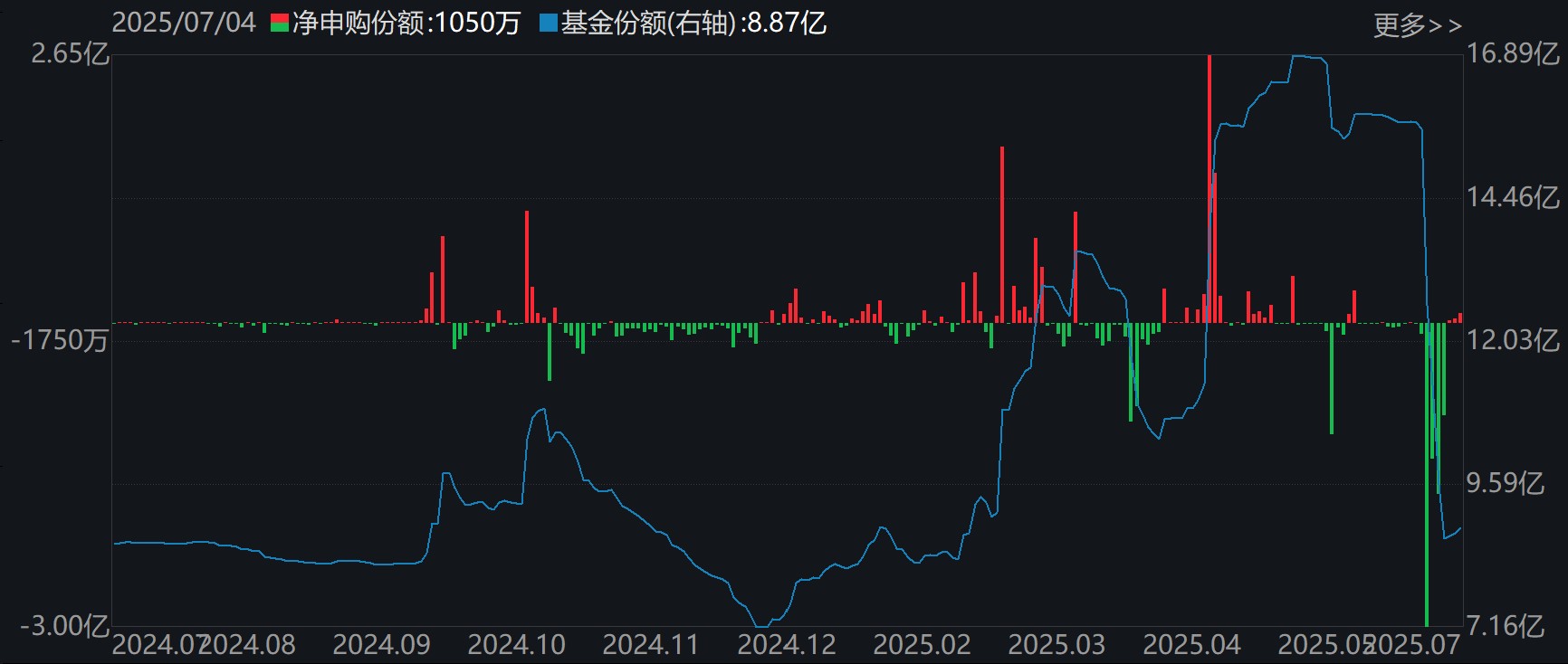 近期持续上涨的钢铁ETF遭到资金抛售,最新份额8.87亿份,相比5月下旬的16.89亿份,缩水近一半。