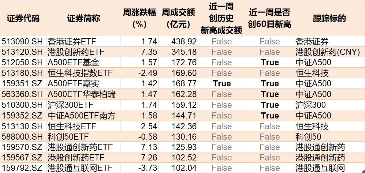 成交额方面,香港证券ETF本周成交额超400亿元,港股创新药ETF本周成交额超300亿元。此外,A500ETF嘉实本周成交额168.77亿元,为上市以来最高周成交额。