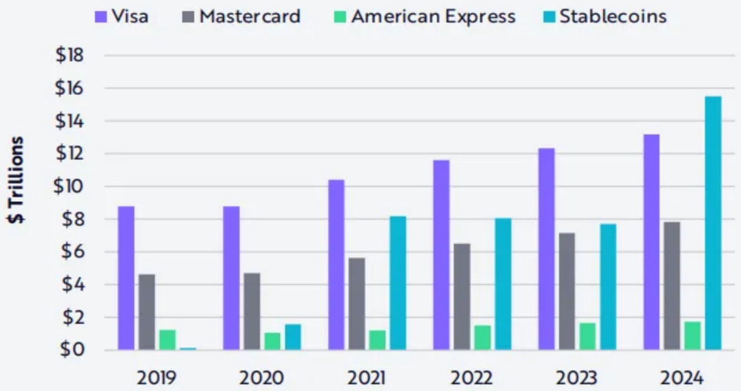 加密货币市场的兴起不仅反映资本流动性扩张,更深层次地体现出全球资金流向、金融权力重构和数字资产范式转移的叙事趋势。在此过程中,稳定币作为加密经济中的核心交易媒介、抵押资产与计价单位,需求快速攀升。其全球发行量从2020年初不足50亿美元增至2022年的1880亿美元,最新已超过2500亿美元。根据ARK Invest报告,2024年稳定币全年交易额达15.6万亿美元,分别相当于Visa和Mastercard的119%和200%,显示其在全球支付系统中的重要性日益上升。