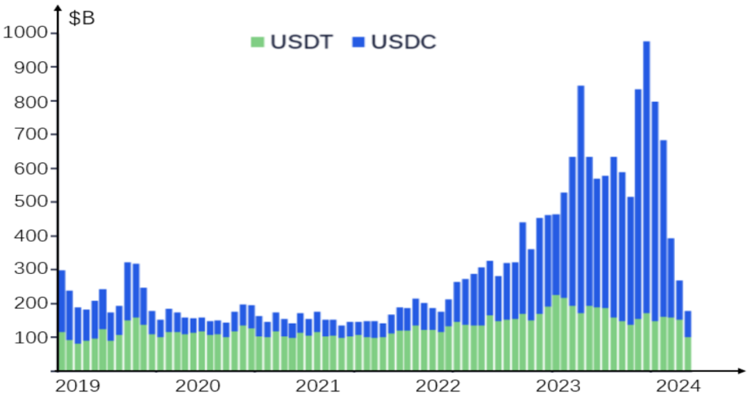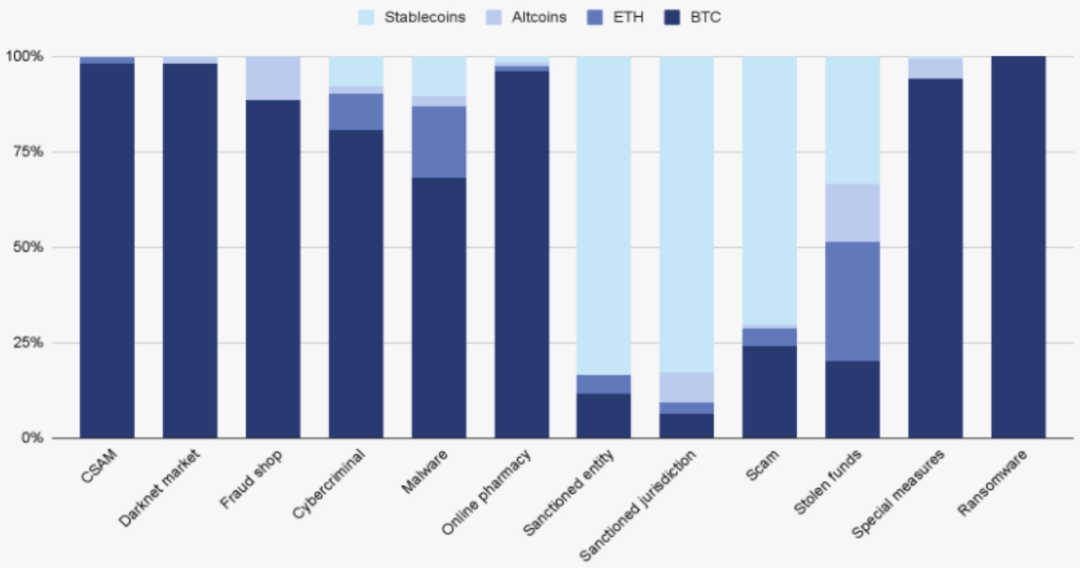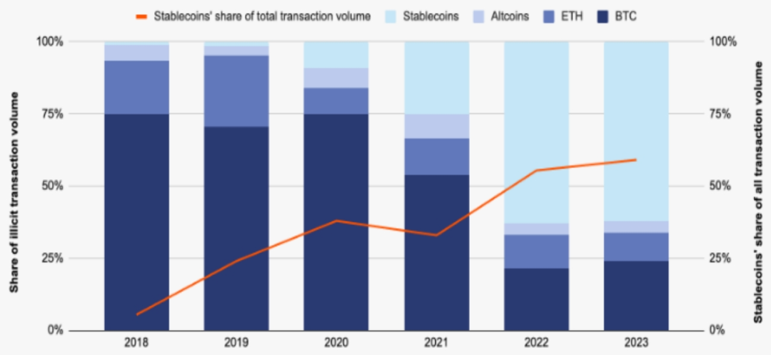 根据Chainalysis 2024报告,2023年全球通过加密货币进行的非法交易金额约为242亿美元,其中60%以上均有稳定币参与,尤其是在诈骗资金流向上USDT占比高达90%。