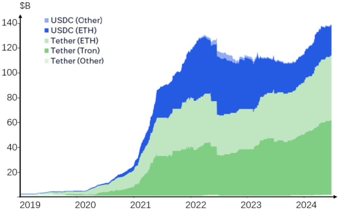 USDT由私人公司Tether于2014年推出,作为最早的稳定币之一,最初基于比特币的Omni协议发行,后逐步扩展至以太坊、波场、Solana等97条区块链。凭借先发优势与广泛流动性,USDT长期主导稳定币市场,但其储备资产的透明度始终存在争议。作为应对,美国金融科技公司Circle和数字货币交易所Coinbase于2018年联合推出了USDC,定位为更透明合规的方案。USDC初期依托以太坊发行,并扩展至Solana、Algorand及Stellar等111条链,其强调1:1法币储备和定期审计,迅速吸引了机构及DeFi领域的用户。