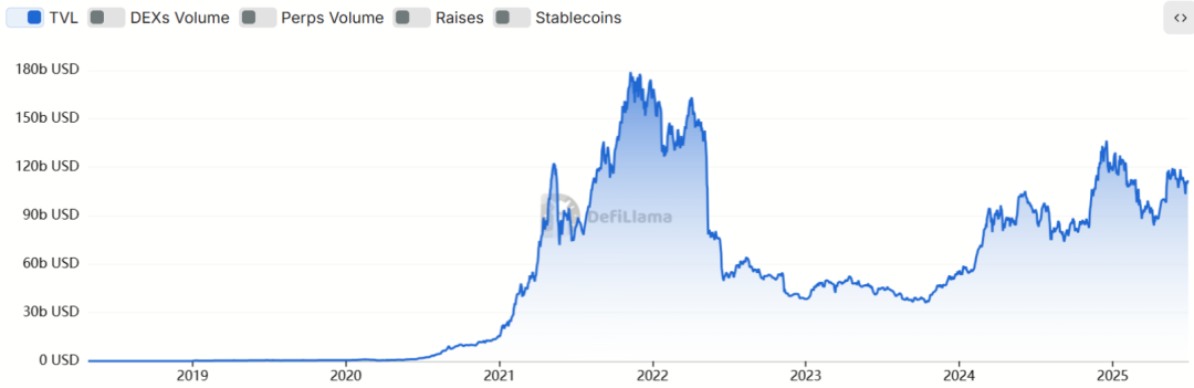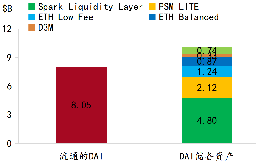 加密资产抵押型稳定币(Crypto-Collateralized Stablecoin)代表项目包括DAI、LUSD等,以加密货币(如ETH、BTC)或其他链上资产作为抵押品,通过智能合约自动调节供应量,以维持价格锚定。因抵押资产波动性大,普遍采用超额抵押机制。例如,DAI目前的流通量为80亿美元,对应锁仓资产价值约为101亿美元,当前抵押率达125%。此类稳定币去中心化程度较高,但更易受加密市场波动影响。