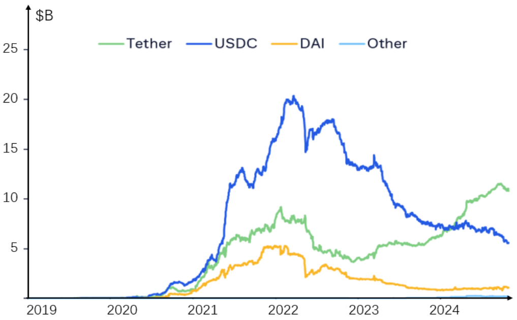 稳定币的快速发展,可能分流部分银行体系的存款资源,进而影响银行的资金池规模和信贷供给能力。在零售端,用户出于追求更高收益的考虑,或将部分银行活期存款(通常利率低于0.5%)配置到年化收益率可达5-10%的DeFi平台。截至2024年底,DeFi平台的总锁仓量已超过1200亿美元,其中稳定币占比超过40%。【注释4】