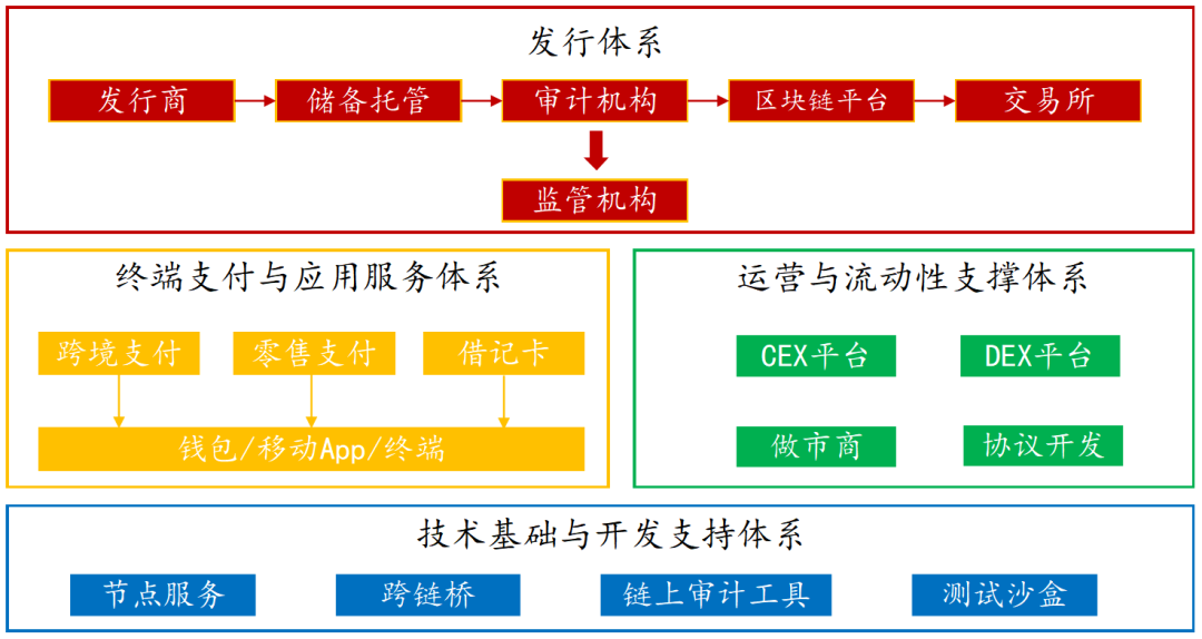稳定币的商业生态主要由发行、运营、支付和技术四大体系组成,形成闭环生态系统。
