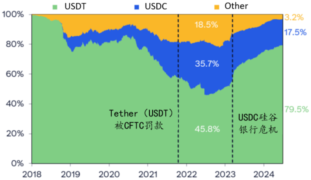 USDT凭借历史积累形成规模优势,而USDC则通过合规优势在特定领域快速渗透。2021年USDT因储备资产透明度争议,USDC市占率曾升至35.7%;但2023年硅谷银行事件导致USDC储备短暂脱钩后,USDT迅速夺回市场份额。