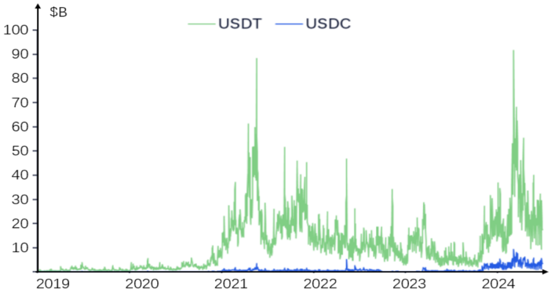 USDT侧重于高频、小额加密交易场景,日均交易量(Trading Volume)达500亿美元,占据稳定币交易量市场份额的70%左右,广泛服务于散户投资者和新兴市场用户,强化其在中心化交易所(CEX)的主导地位。