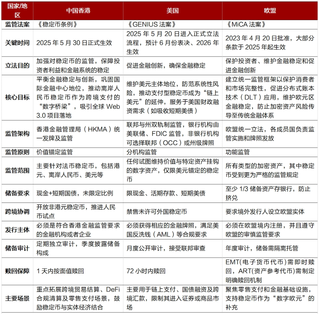 当前全球主要的稳定币监管法案包括中国香港《稳定币条例》、美国《GENIUS法案》和欧盟《加密资产监管法案》(MiCA)。从监管模式对比来看,三大司法管辖区的监管制度设计呈现出差异化的战略导向:中国香港侧重开放与兼容,美国强化美元主导地位,欧盟追求统一与安全。