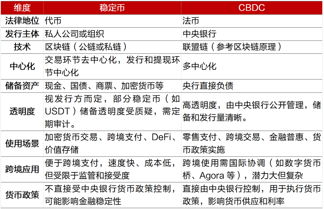 CBDC由央行主导发行,一般采用联盟链等多中心化架构,强调安全可控与合规监管,是主权法币的数字延伸。与之不同的是,稳定币主要由私人公司或组织通过区块链技术在公链或私链上自主发行,强调去中心化和链上交易不可篡改的特性,其交易结果不可逆且不受第三方干预。