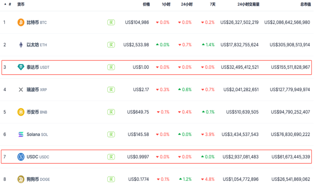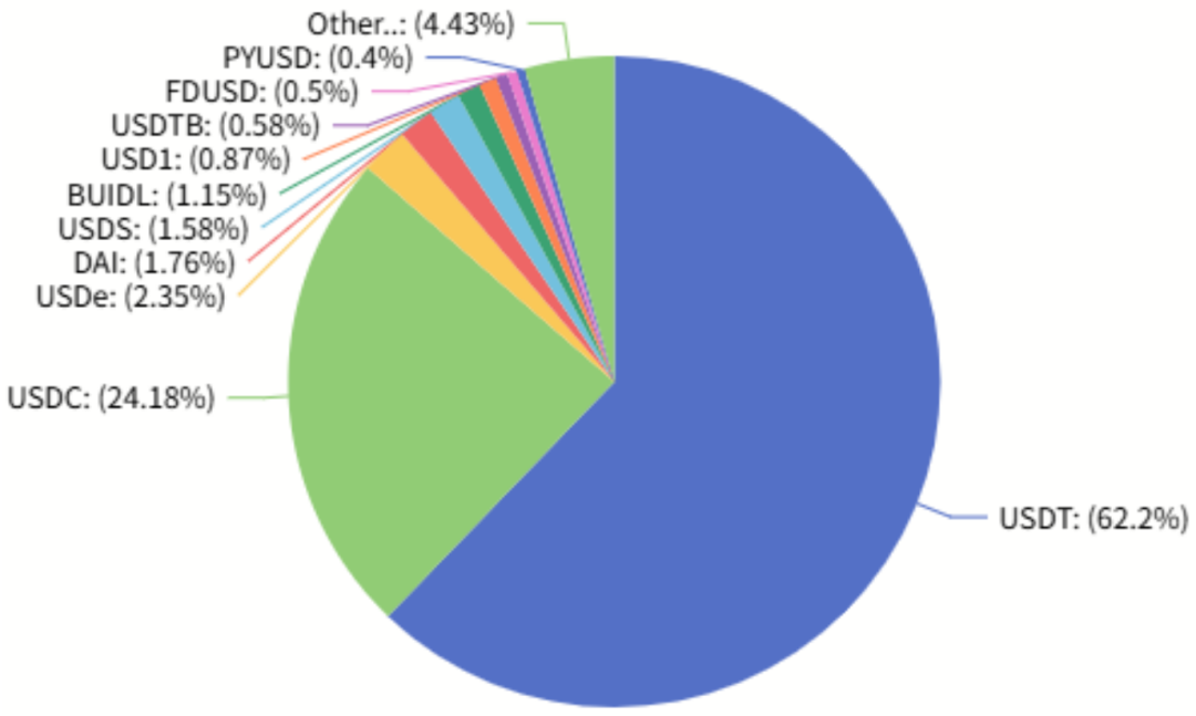 截至2025年6月,稳定币发行规模超2500亿美元,有250多种稳定币,其中锚定美元的稳定币发行金额占全部稳定币的99.71%,具有压倒性领先优势。市场呈现出“一超一强,百花齐放”的格局,“一超”是USDT,规模超1550亿美元,市场占比62%。“一强”为USDC,规模达610亿美元,市场占比24%;在加密货币市场中市值分列第3和第7位。“百花齐放”指USDe、DAI、USDS等其他250多种稳定币,总市值占比约14%,在去中心化交易所、电子商务、NFT(非同质化代币)等领域扮演越来越重要的作用。