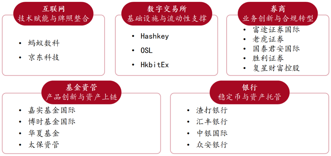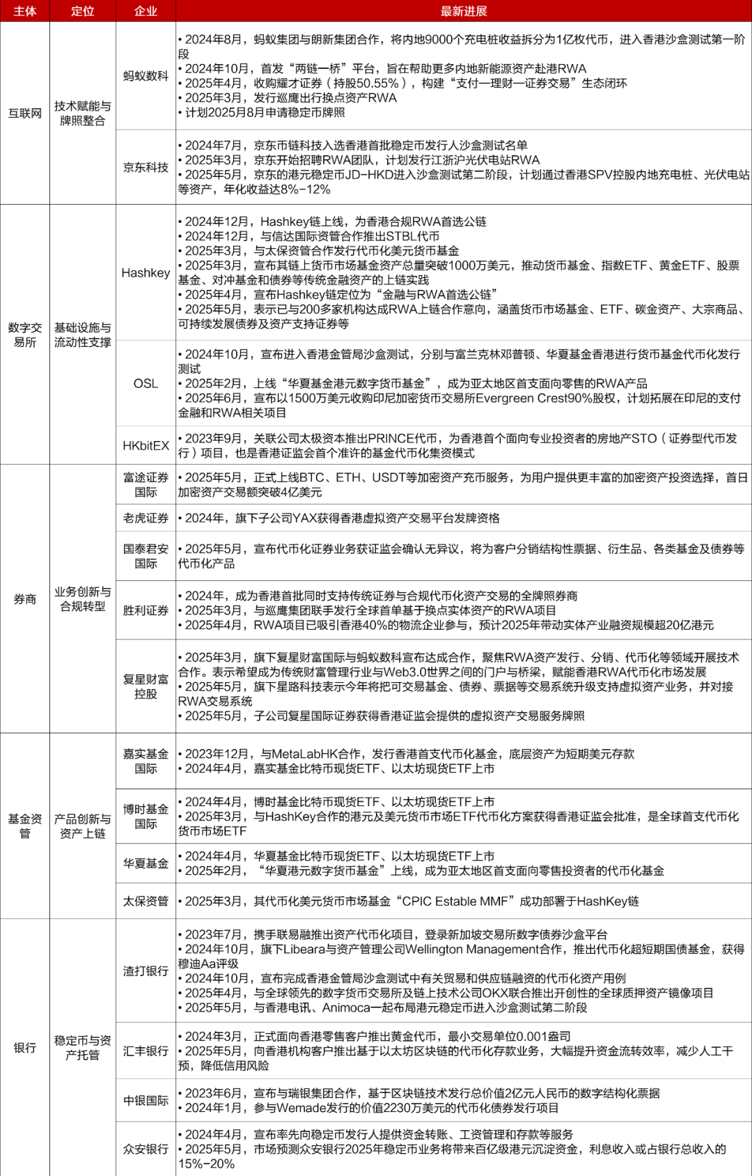 在政策与市场探索方面,香港近年来通过虚拟资产政策创新与机构实践,逐渐成为RWA发展的前沿阵地。目前,香港主要有互联网、交易所、券商、基金资管、银行等五大主体参与RWA项目,在技术赋能、基础设施、业务创新、产品创新、资产托管等方面积极探索。
