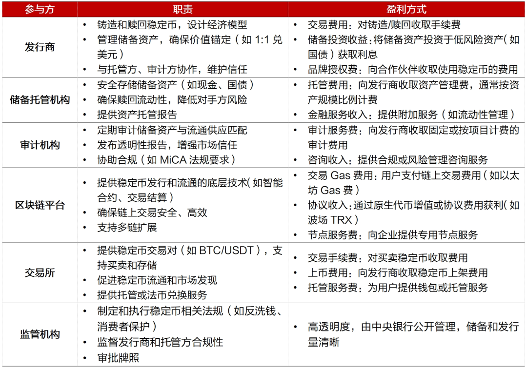 其中,发行商主导稳定币的铸造、赎回及经济模型设计,主要收入源自储备资产收益和交易手续费,但需应对高强度合规审查和操作风险。储备托管机构(如银行)替发行商保管法币或高流动性抵押资产,确保稳定币的1:1可赎回性,成为稳定机制的关键支点。审计机构定期核查和披露储备资产情况,提升稳定币透明度与市场信任。区块链平台提供底层技术支撑,包括智能合约执行、账本记录和网络共识。交易所不仅是核心流通渠道,还通过撮合交易与提供流动性创造收益,推动二级市场交易活跃。监管机构(如美国SEC、香港金管局)通过立法与监管确保稳定币产品在发行和流通环节的合规性,是生态长期发展的制度保障。