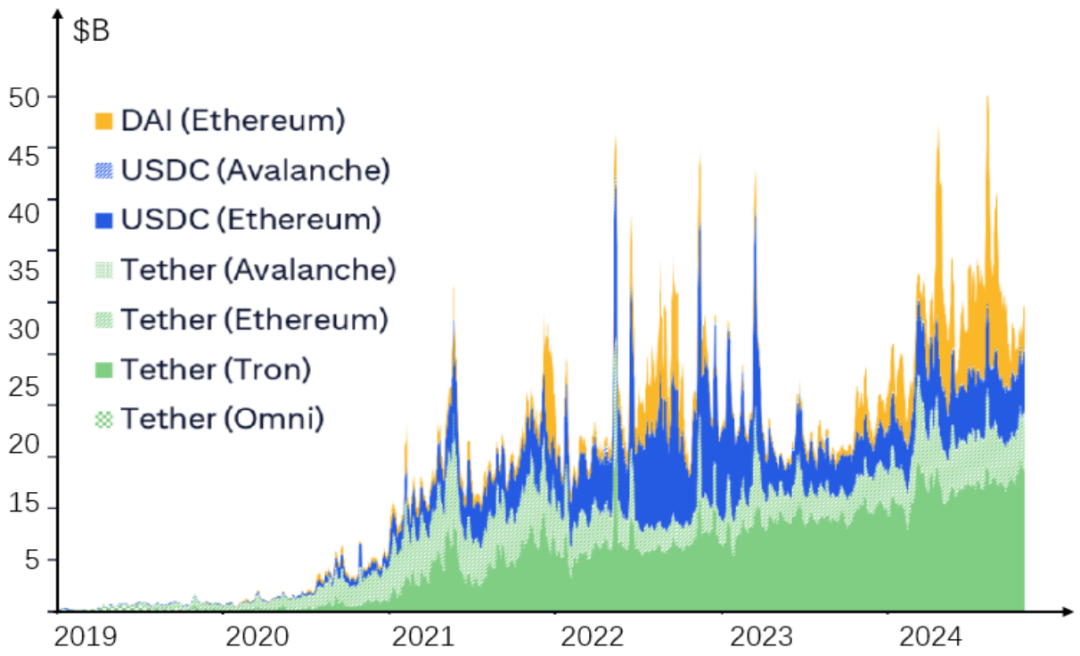 稳定币依托区块链技术,能够实现便捷的点对点跨境结算,这种特性使其在一定程度上突破了传统外汇管理框架的约束,增加了跨境资本流动管理的复杂性。在资本流动管理较为严格的国家,企业和个人存在通过将法币兑换为稳定币并转移至境外区块链钱包,从而实现资金跨境流动的可能性。这不仅可能影响外汇储备的稳定性,更需关注的是,稳定币自身的价值波动存在传导至依赖其进行跨境交易的金融机构的风险,进而对区域金融稳定构成潜在影响。