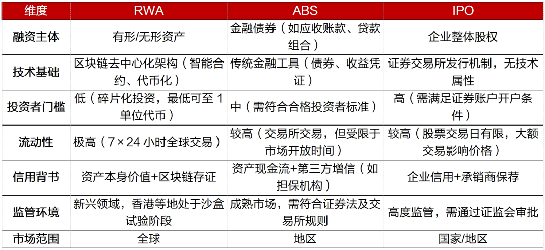 从金融结构角度看,RWA与ABS(资产证券化)和IPO(首次公开募股)存在一定共性。ABS是将缺乏流动性的资产(如应收账款、租赁合同)打包成证券产品,在传统证券交易所发行;IPO则是企业首次向公众出售股票以募集资金用于经营扩张或债务偿还。但ABS、IPO与RWA相比,仍存在明显的缺陷:一是投资门槛较高,中小投资者难以直接参与;而RWA通过代币化将资产拆分为更小单位,大幅降低了参与门槛。二是ABS、IPO流程繁琐且依赖大量中介机构,操作复杂、耗时较长;RWA基于区块链智能合约执行交易,流程高效且显著降低了中介成本。三是传统模式受限于国家或地区的市场规则,难以吸引全球投资者;RWA借助区块链的跨境特性,可实现全球投资者对同一资产的共同参与,极大拓展了市场覆盖范围。因此,ABS、IPO构成了RWA的传统金融基础,而RWA则是二者的技术进阶形态。RWA通过代币化机制打破了资产证券化与全球资本市场之间的技术壁垒,为实体经济提供了介于ABS局部融资与IPO整体上市之间的全新路径。