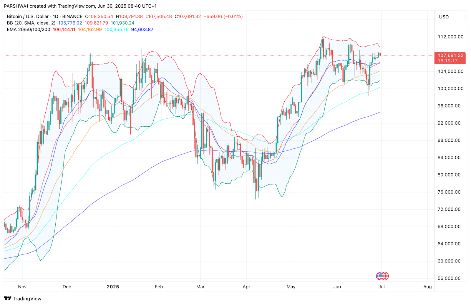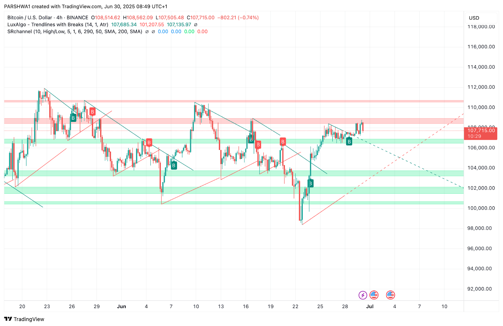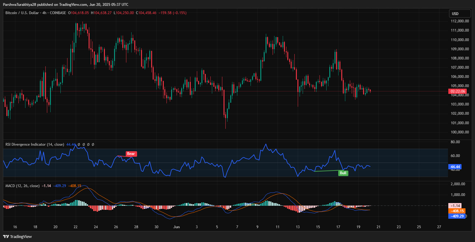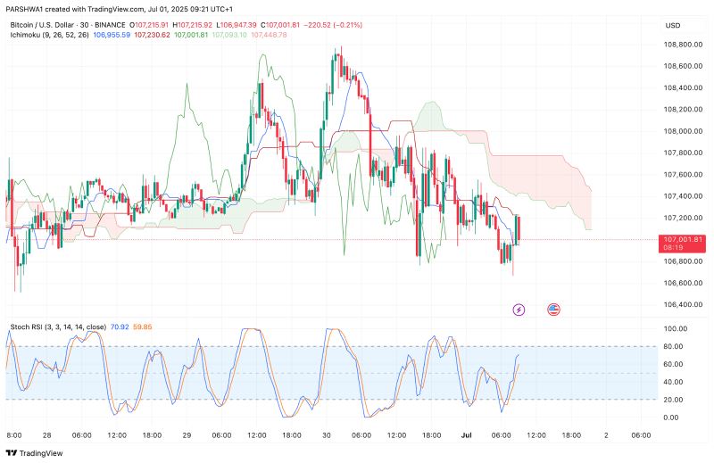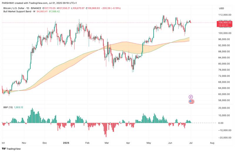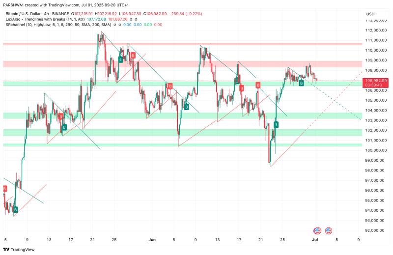 4小时图上的布林带正在收窄,这通常预示着波动性扩大。鉴于BTC的盘整结构,突破可能最早在7月2日发生,而方向可能取决于日收盘价在108,500美元上方或105,500美元下方。