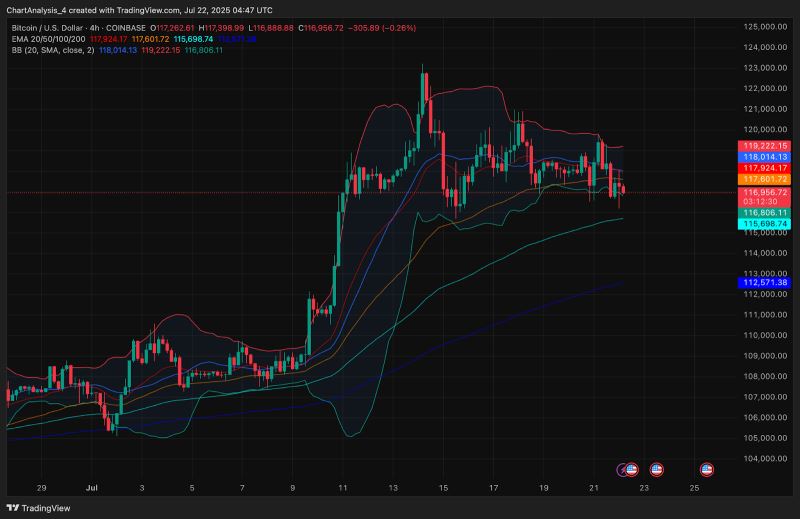 4小时图强化了这一观点。BTC价格收盘跌破20日均线日均线日均线美元)目前构成近期支撑位。布林带开始收缩,表明在可能出现突破之前,波动性有所降低。116,800美元附近的下轨正在受到考验,突破该水平可能引发进一步下行,跌向200日均线小时图上的布林带通道明显收紧,价格紧贴通道下轨。从历史上看,这种通道通道通常预示着突破性波动。然而,由于动能略微偏向看跌,如果进一步跌破116,800美元,则可能将价格推向114,800美元附近的下通道支撑位。