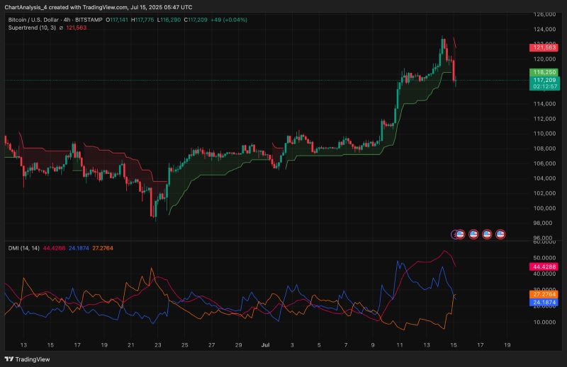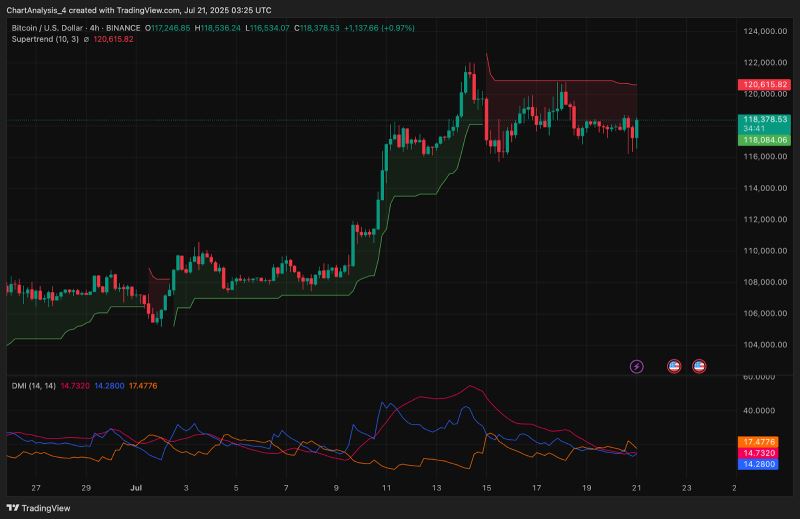 链上流动性的涌现和衍生品市场情绪都利好多头。4 小时时间框架内的超级趋势指标在 118,000 美元上方保持看涨势头,突破 120,600 美元则可能开启趋势延续。4 小时 DMI 显示下降趋势,但 +DI 和 -DI 仍接近收敛,这在趋势扩展之前很常见。