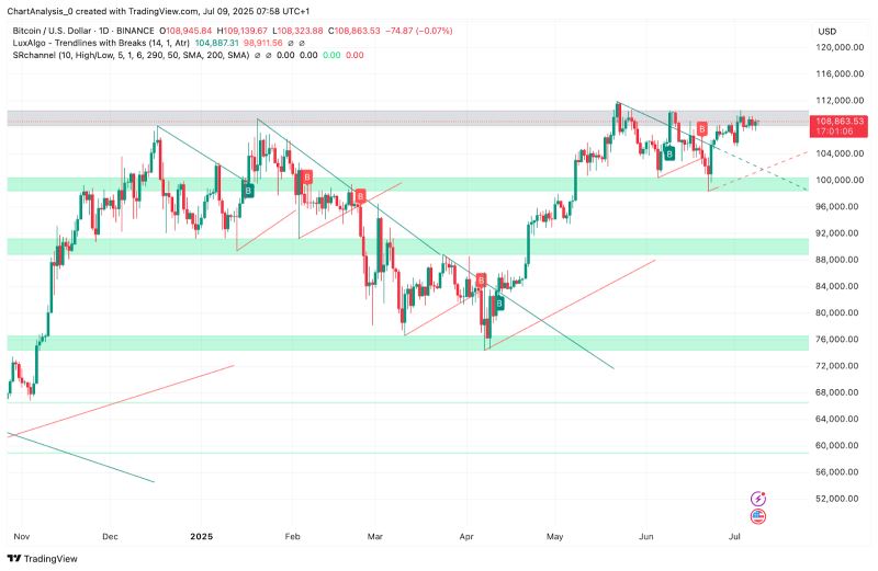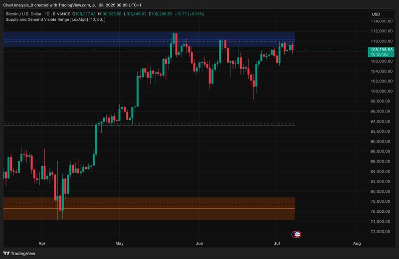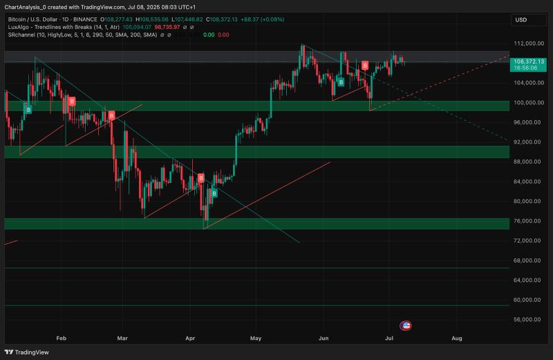 经过一周的窄幅波动后,比特币价格目前徘徊在 108,300 美元左右,多头持续测试 108,800 美元至 110,400 美元之间的上方供应区域。价格走势仍受制于明确的水平阻力位,但不断走高的低点和看涨的市场结构表明,突破可能正在酝酿。交易员们正在密切关注比特币今日价格能否在周中保持上涨势头。