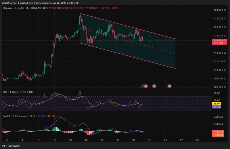 BTC价格继续在2小时图上可见的下行平行通道边界附近徘徊,自7月初跌破123,000美元以来,高点和低点均明显走低。这一结构正在将价格压缩至一个收窄的区间,支撑位在115,500美元附近,阻力位在118,000美元附近。