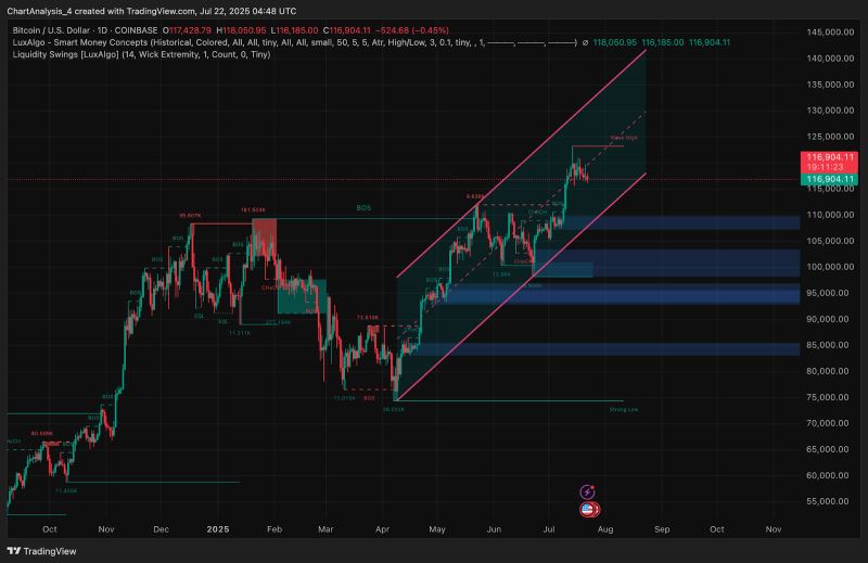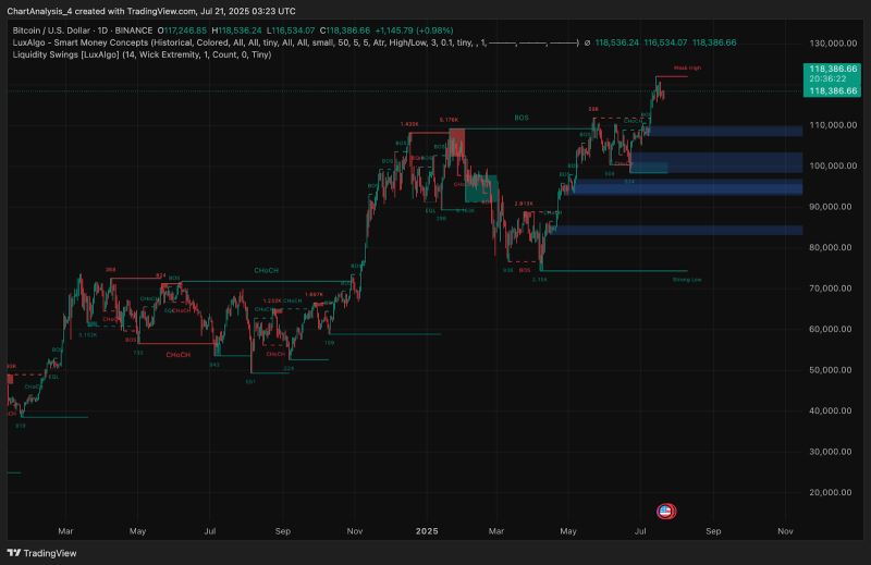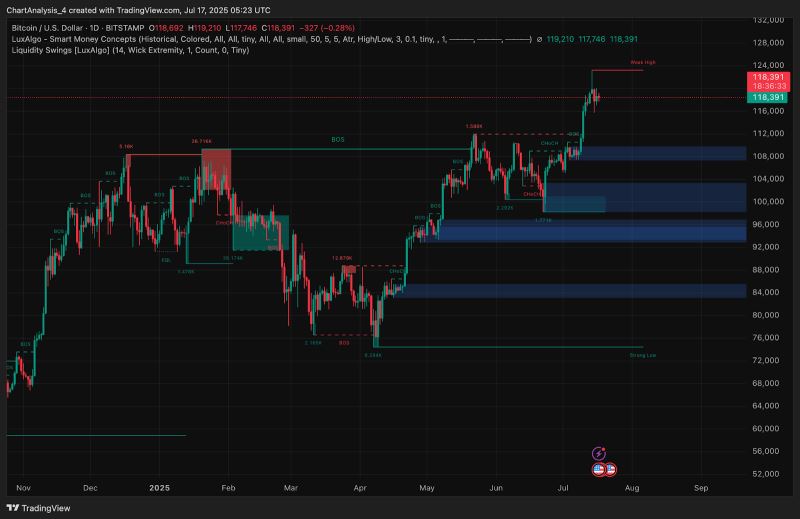 Smart Money Concepts (SMC) 显示,比特币交易价格略低于119,000美元的明显弱势高点。7月初的突破结构 (BOS) 确认了看涨意愿,但此后价格在这一关键流动性区域内停滞不前。在新的突破结构 (BOS) 出现之前,价格仍面临在当前区域内盘整的风险。
