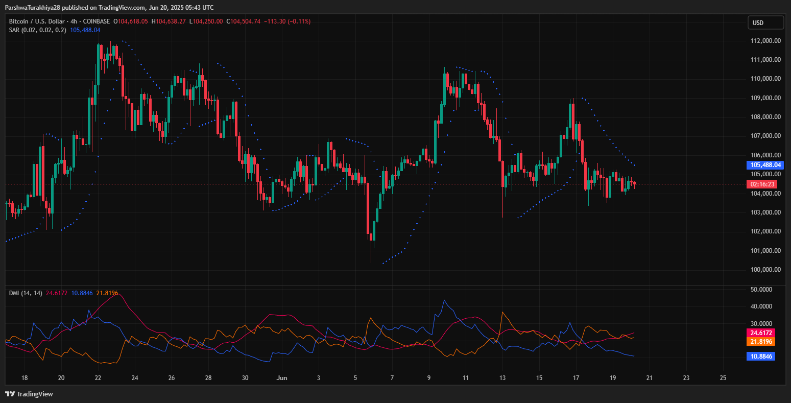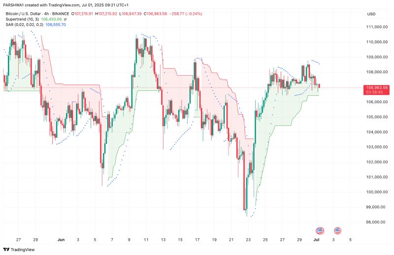 超级趋势指标在4小时图上于106,450美元处转为看跌,与此同时,抛物线转向指标点再次出现在价格上方。这种汇合表明下行压力正在增强。