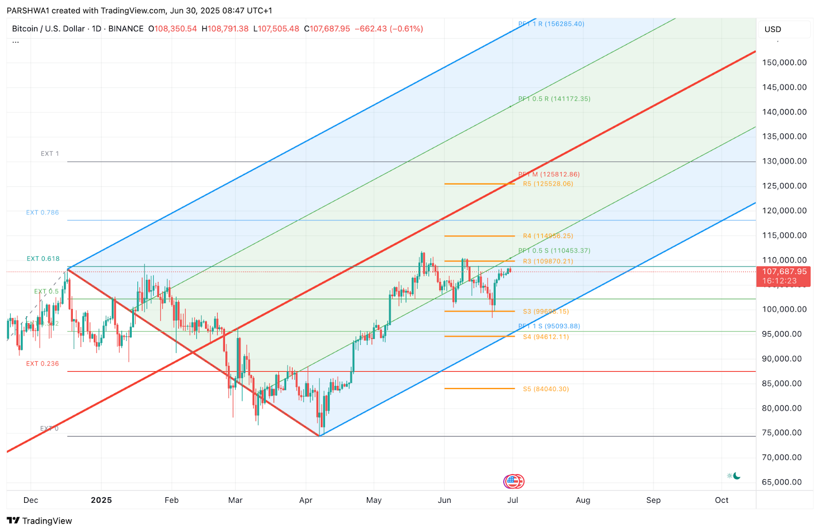 如果突破 110,000 美元的阻力位,且成交量扩大,且日收盘价高于布林带上轨,BTC 可能有机会触及 114,500-115,000 美元区域,该区域与 R4 枢轴点和前期高点一致。涨势可能延续至 125,000 美元的斐波那契扩展位,但这需要强劲的宏观顺风和流动性,并突破当前高点。