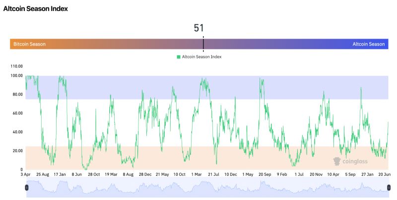 山寨币季节指数为51,表明BTC和山寨币的轮动几乎均衡,这是一种中性状态,通常预示着资本将重新分配到主要资产。如果比特币在成交量支撑下突破119,000美元区域,其主导地位可能会再次转向对其有利。