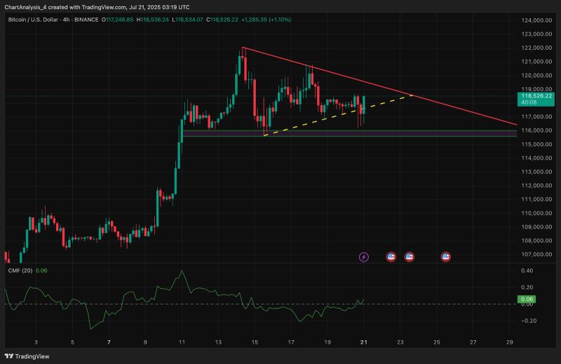 比特币目前在4小时图上处于对称三角形形态,阻力位在119,000美元,支撑位在116,000美元附近。盘整结构延续了本月初比特币价格从101,000美元飙升的垂直走势。这一楔形进一步压缩了波动性,预示着未来24-48小时内可能出现决定性走势。