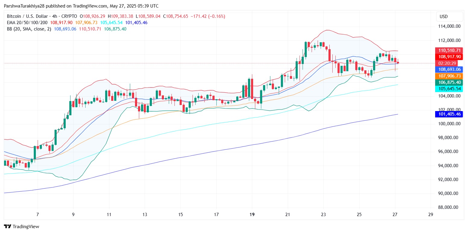 4小时图上,比特币近期突破了上升楔形形态,目前正在测试对称三角形结构的下边界,支撑位在108,000美元附近,阻力位在110,600美元附近。此次回调是继5月20日以来的强劲反弹之后出现的,在此期间,比特币价格在五天内飙升了近12%。然而,未能守住楔形顶部,并随后在110,500美元附近受阻,表明近期市场已出现疲态。