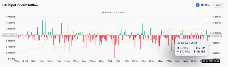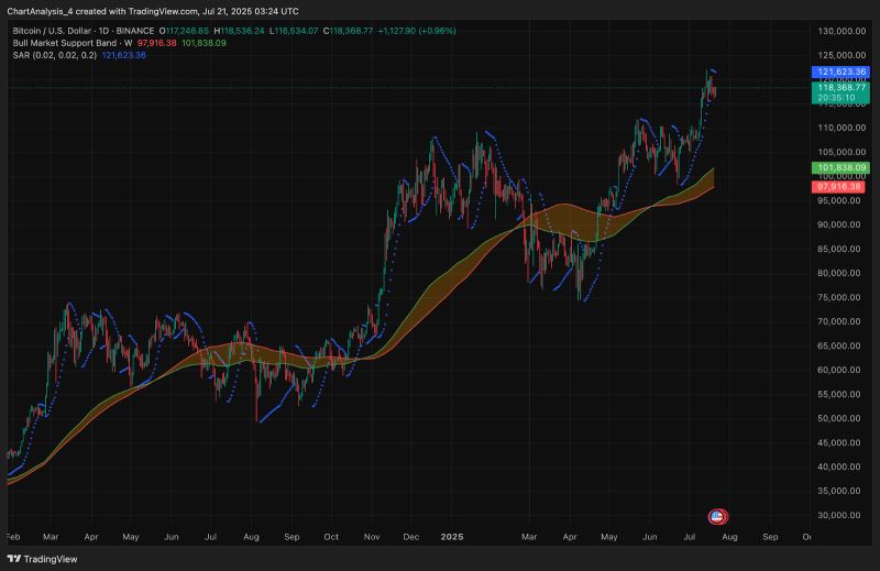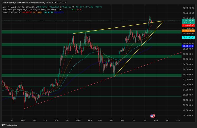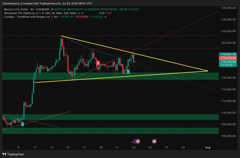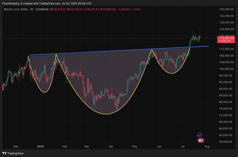 截至7月23日,比特币交易价格约为118,700美元,在突破日线图上典型的倒头肩形态后,目前处于盘整阶段。上周,比特币突破了112,000美元的颈线位,此后价格一路上涨至120,180美元的局部高点,随后出现停滞。交易员们目前正在评估,在日内价格走势趋紧的背景下,比特币能否维持其看涨结构。
