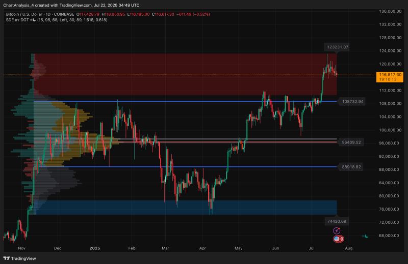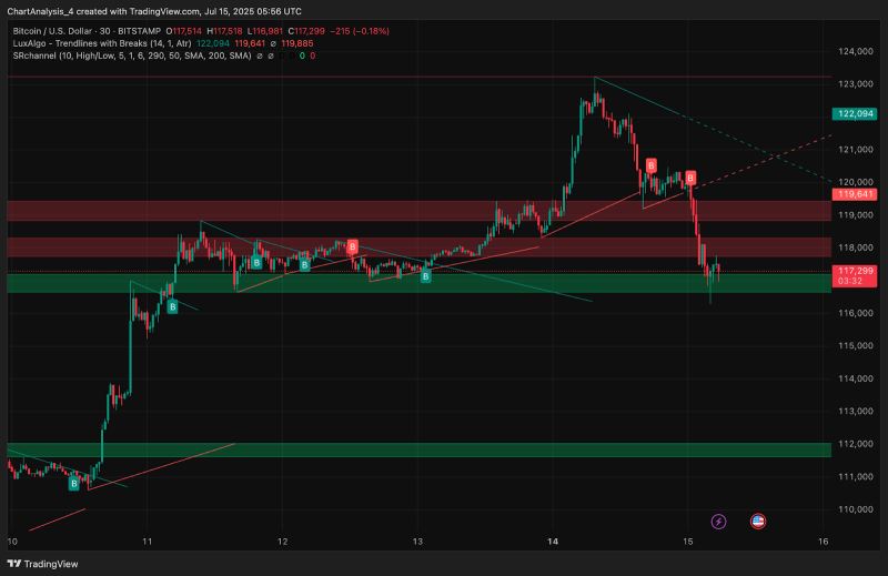 7月11日,比特币突破了区间波动,突破15,000美元,测试了123,236美元,这是日线交易量曲线上以红色订单块标记的关键供应区域。然而,价格未能守住122,000美元上方,并在4小时图上迅速回落至118,000美元以下。