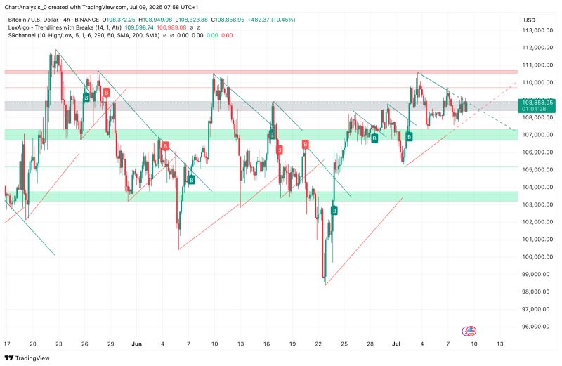 7月9日,除非交易量大幅飙升,否则比特币价格可能会继续在107,000美元至110,500美元区间震荡。如果多头能够以4小时K线美元并确认突破,那么下一个目标价位将是111,200美元,随后是114,000美元的通道顶部。