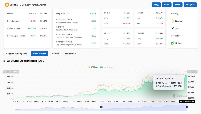 比特币价格今日上涨的原因可以解释为衍生品市场需求的复苏以及日内流动性的恢复。据 Coinglass 称,比特币未平仓合约已升至 842.7 亿美元,而每日期货交易量跃升 54.43%,达到 697.7 亿美元。币安顶级交易员的多空比为 1.68,明显偏重多头仓位。