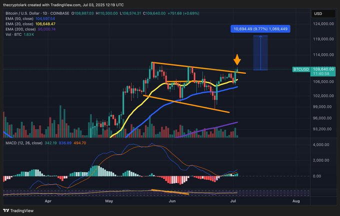 Lark Davis 通过三角形模式发出信号,暗示 BTC 可能突破 9.77%,目标达到 12 万美元。