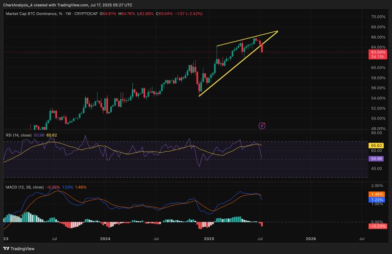 比特币价格今日下跌的主要原因是多项指标的动能减弱以及BTC主导地位的减弱。BTC主导地位周线图确认了上升楔形的突破,RSI大幅下跌至50.98。MACD也确认了看跌交叉区域,表明避险资金可能从BTC转向山寨币。