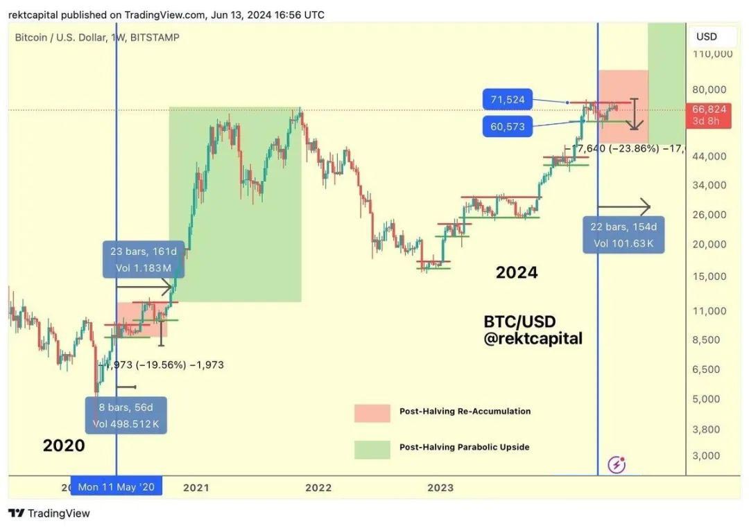 Rekt Capital 表示:“这种持续的盘整使价格能够与历史减半周期重新同步,这样我们就可以实现正常的牛
