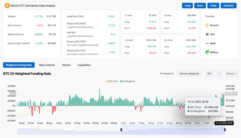 Coinglass 的数据显示,24 小时内近 1.81 亿美元的头寸被抹去,其中 3960 万美元为空头头寸,1.417 亿美元为多头头寸,这强烈表明过度杠杆的买家已被清空。