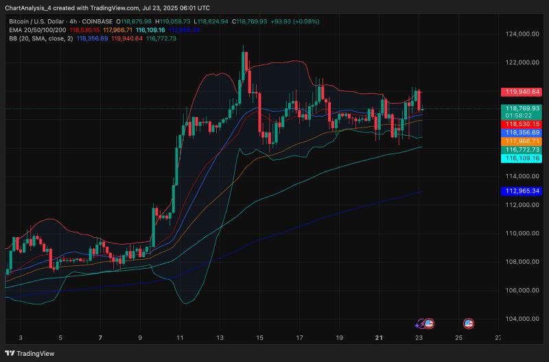 布林带的技术面收缩也很明显,尤其是在4小时图上。随着布林带宽度在118,000美元附近收紧,市场正在为波动性扩张做准备。最终是上涨还是下跌,取决于多头能否凭借成交量收复120,000美元的关口。