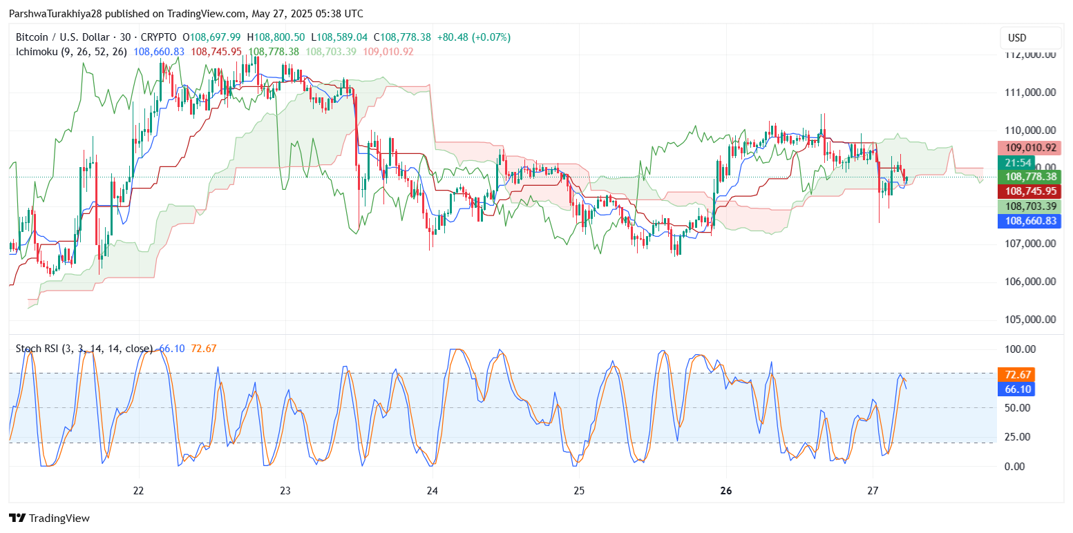 观察30分钟图上的一目均衡图(Ichimoku Cloud),价格走势在短暂跌破转换线(Tenkan-sen)后,正在云图(Kumo Cloud)内部盘整。位于108,750美元附近的持平基准线(Kijun-sen)构成了磁力支撑,而先行线(Senkou Span)A/B线开始趋于平缓,反映出市场犹豫不决。价格尚未再次反转云图看涨走势,如果未能突破10.92万美元,则可能导致价格再次跌向10.75万美元至10.68万美元的需求区间。