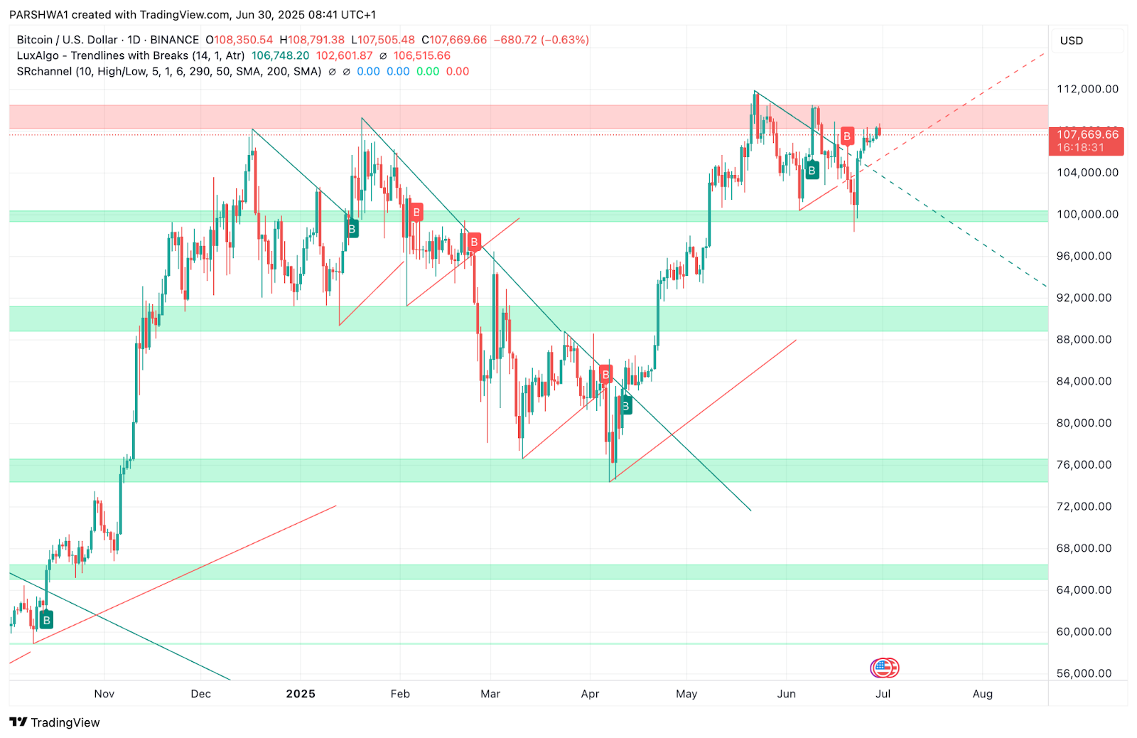 比特币价格的月度前景表明,只要 104,000 美元至 106,000 美元区域保持支撑,比特币价格就将呈现上行趋势。6 月份多次突破趋势线,使短期结构转向看涨,BTC 已收复 20/50/100 均线 日均线 美元)目前呈上升趋势,为当前格局增添了力量。