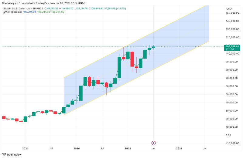 BTC 继续在月线图上保持上升通道,在 108,800-109,000 美元的中线附近徘徊。虽然目前上涨势头受到限制,但整体结构利好比特币价格继续上涨,除非跌破 106,800 美元。