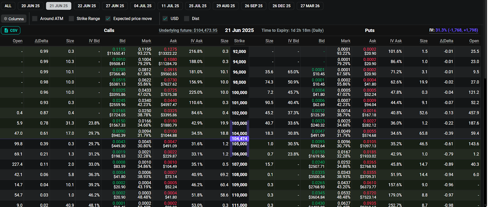 从 6 月 21 日到期的 Deribit 期权来看,大量未平仓合约集中在执行价为 105,000 美元和 104,000 美元的期权上,看跌期权的规模和隐含波动率都略高于看涨期权。