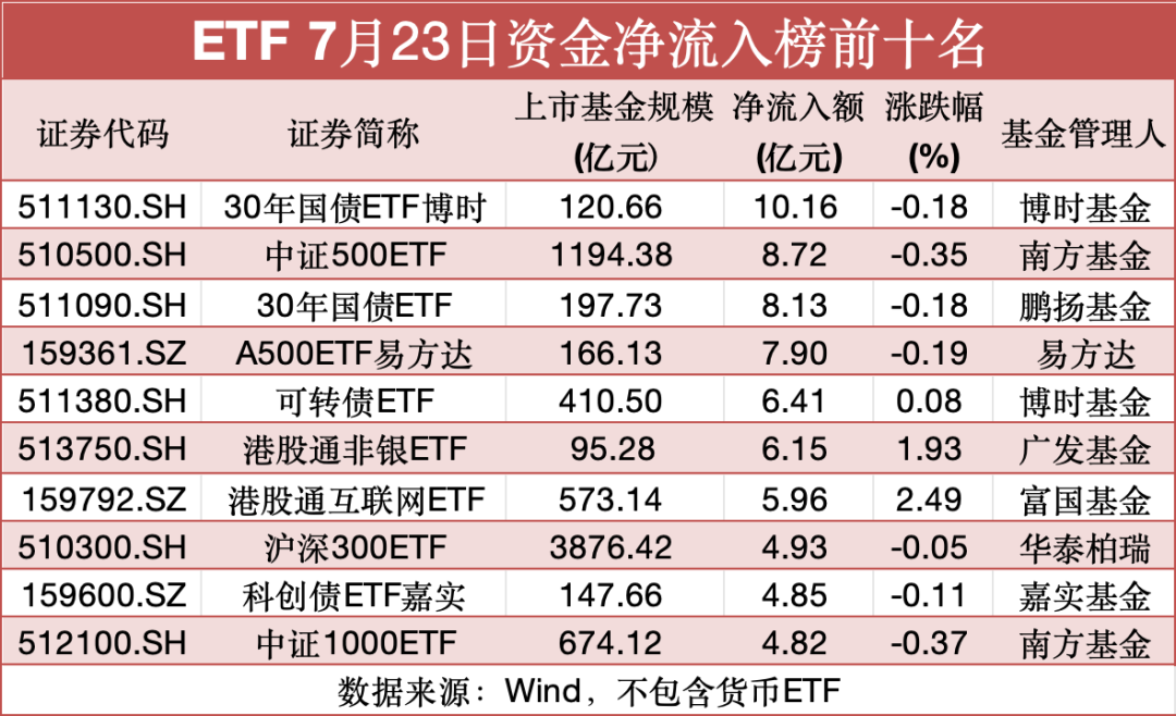 Wind数据显示,7月23日,南方基金旗下中证500ETF资金净流入达到8.72亿元,在A股股票ETF中位居榜首。此外,A500ETF易方达资金净流入也逼近8亿元。