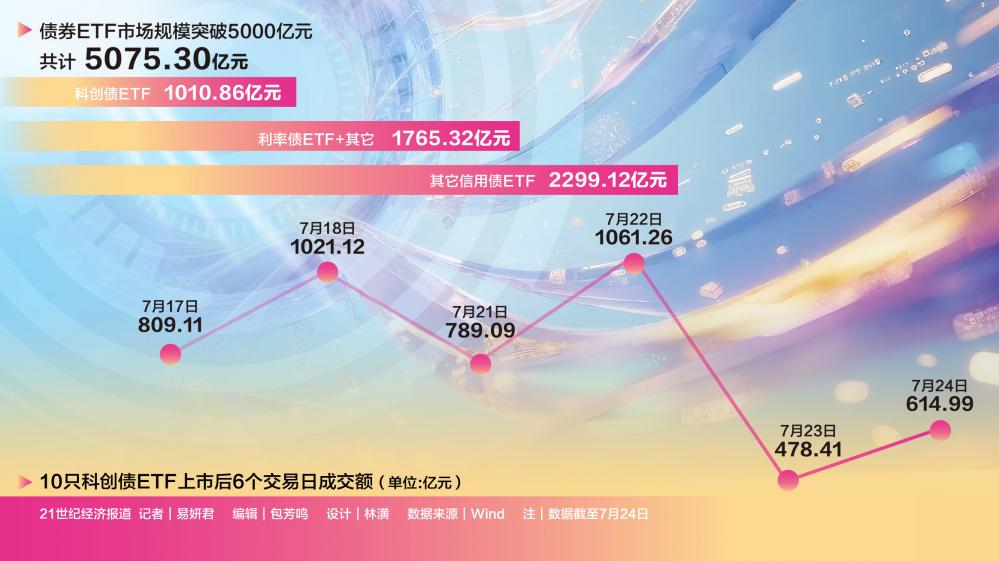 据Wind统计,首批10只科创债ETF上市后的第5个交易日(7月23日),其总规模迅速突破千亿元大关;7月24日,该类ETF的规模继续增长,达到1010.86亿元。目前,在创新产品的助攻下,整个债券ETF市场规模已突破5000亿元。