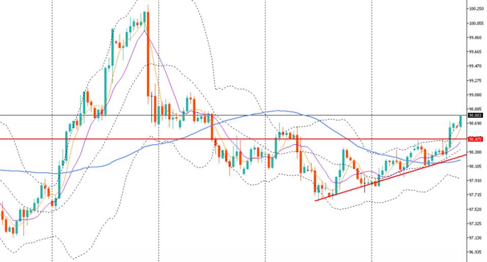美日强势拉升,上破关键压力148.50,短线趋势彻底转强,多单可继续持有,后市有望挑战149,149.50。