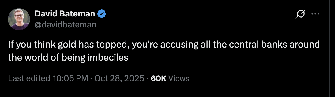 黄金年初至今仍上涨约50%,受创纪录的央行购买、持续的财政失衡和正在进行的“贬值交易”推动,投资者寻求保护以应对政府债务膨胀和法定货币贬值。