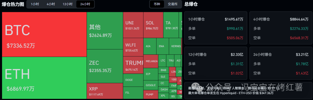 过去24小时全网共有138,087人被被爆仓,爆仓总金额为$3.21亿美元,多单爆仓1.78亿美元,空单爆仓1.43亿美元。